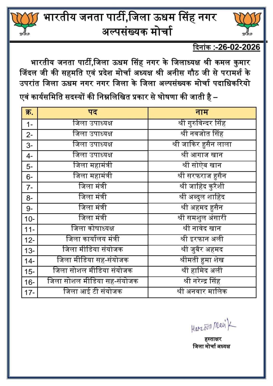 भारतीय जनता पार्टी, जिला उधम सिंह नगर के जिला अध्यक्ष श्री कमल कुमार जिंदल जी की सहमति एवं प्रदेश अल्पसंख्यक मोर्चा अध्यक्ष श्री अनीस गौड़ जी से परामर्श उपरांत जिला उधम सिंह नगर अल्पसंख्यक मोर्चा के जिला पदाधिकारियों एवं कार्यसमिति सदस्यों की घोषणा निम्नलिखित प्रकार से की जाती है—