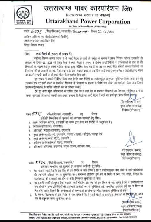 देहरादून। उत्तराखण्ड पावर कॉर्पोरेशन लिमिटेड (UPCL) ने स्मार्ट मीटरों को लेकर बढ़ती शिकायतों के बीच बड़ा कदम उठाया है। प्रबंध निदेशक की अध्यक्षता में 22 नवंबर 2025 को हुई समीक्षा बैठक के बाद यह स्पष्ट निर्देश जारी किए गए कि जब तक स्मार्ट मीटरों से जुड़ी सभी शिकायतों का निस्तारण नहीं हो जाता, तब तक प्रदेश में स्मार्ट मीटर बदलने का कार्य तत्काल प्रभाव से रोका जाए।