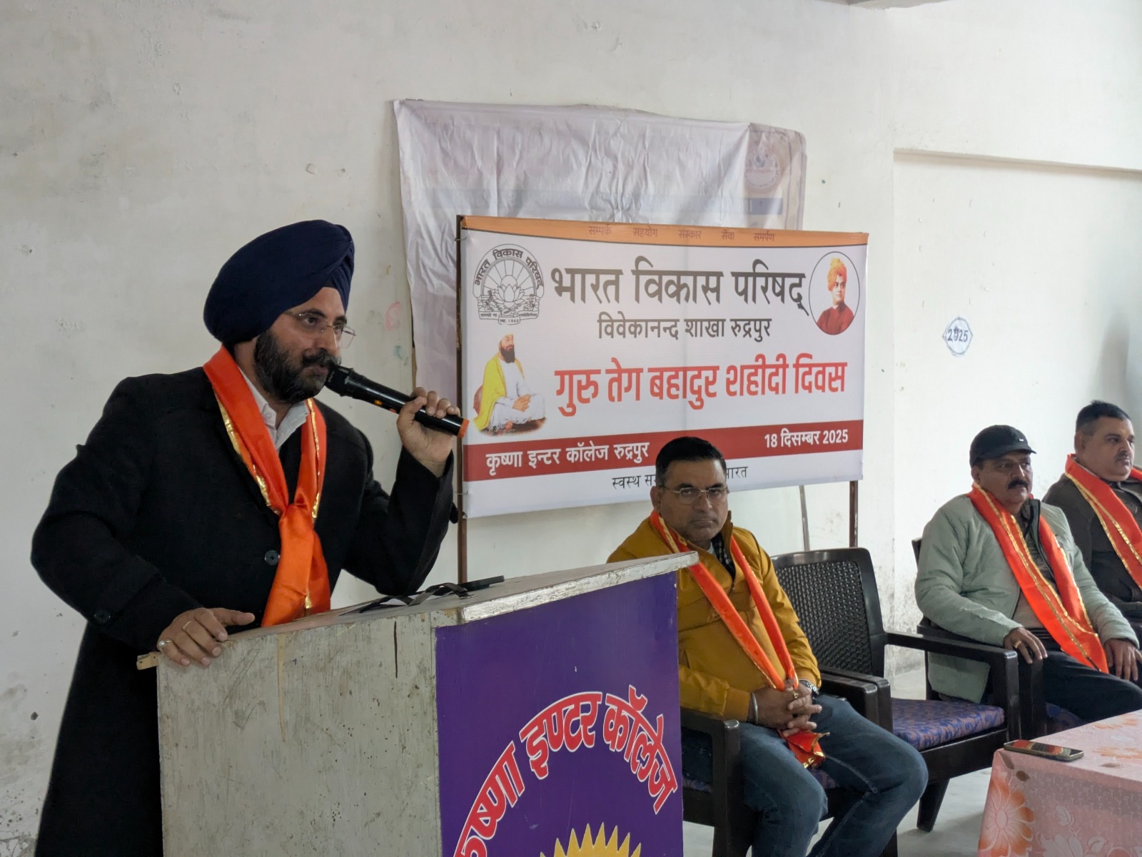 भारत विकास परिषद विवेकानन्द शाखा, रुद्रपुर द्वारा श्री गुरु तेग बहादुर शहीदी दिवस के अवसर पर कृष्णा इंटर कॉलेज, रुद्रपुर में एक गरिमामय कार्यक्रम का आयोजन किया गया। परिषद की परंपरा के अनुसार कार्यक्रम का शुभारंभ भारत माता एवं स्वामी विवेकानन्द जी के चित्रों के सम्मुख दीप प्रज्ज्वलन एवं पुष्पार्चन से किया गया, जिसके पश्चात वन्देमातरम् का सामूहिक गान हुआ।